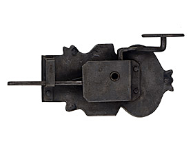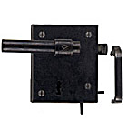 In these locks, a latch protrudes from the upper edge of the box. The handle is used to lift the latch out of the strike plate. The other side has a handle with a pin that is inserted through the lock nut.
